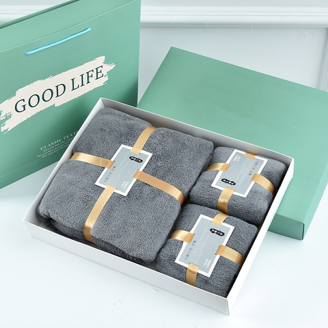 ชุดผ้าขนหนูโรงแรมคุณภาพสูงแบบกำหนดเองขายส่ง กล่องของขวัญผ้าขนหนูขอบโค้ง ผ้าขนหนูคอรัลฟลีซเนื้อนุ่ม ซึมซับน้ำได้ดี ผ้าเช็ดหน้า ผ้าเช็ดตัว 3 in 1